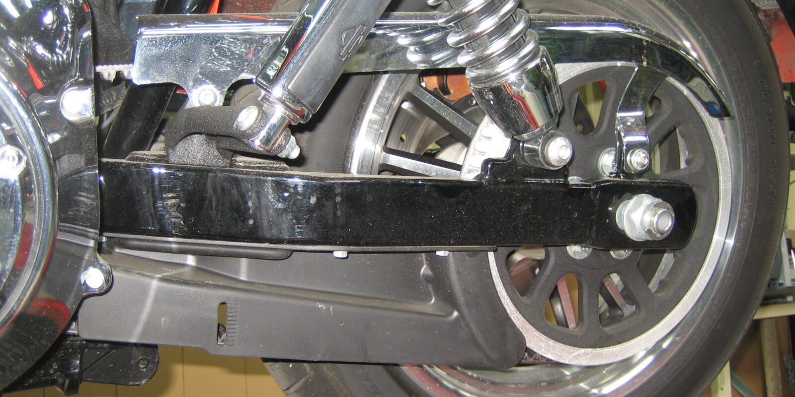 | 08モデルローライダーのノーマルの黒いスウィングアームをぴかぴかのクロームスウィングアームに交換する作業です。 |