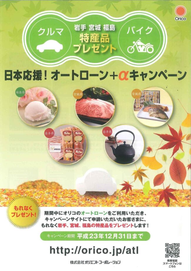 キャンペーンのご案内です。 平成23年12月31日までの期間中、オリコのクレジットをご利用頂き、キャンペーンサイトにてご申請頂いた方々に・・・もれなく!岩手・宮城・福島の特産品をプレゼント! 年内まで特別低金利2.9%実…