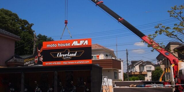 新しいSIGNBOARDをクレーンでつり上げ慎重に取付作業が炎天下のなか進んでいます!