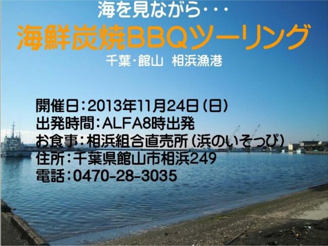 次回ツーリングのお知らせです。 『海を見ながら・・・海鮮炭焼BBQツーリング』 IN 千葉・館山 相浜漁港 開催日:2013年11月24日(日) 出発時間:ALFA8時出発 お食事:相浜組合直売所(浜のいそっぴ) 住所…