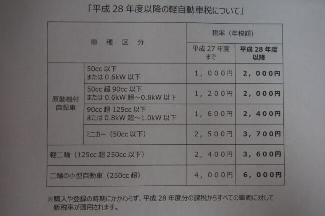 平成28年度以降の軽自動車税の税率が変更になります ハーレーダビッドソン東久留米のブログBy alfa2016年3月29日税制改革に伴い、平成28年度以降の軽自動車税の税率が変更になります。 (平成28年4月1日以降)ご参考までに・・・。