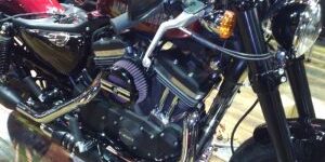 と、ショールームではXL1200CXのエアークリーナーカスタム車 展示しています。