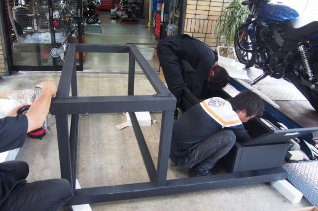 皆様の愛車を整備するサービス工場内は意識的に整理整頓! 新たなワークベンチを組立設置作業中。#ワークベンチ #サービス工場 #ハーレー