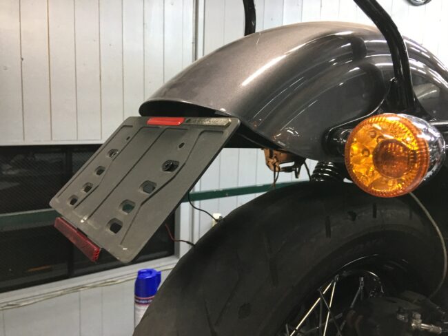 リアフェンダー周りをスッキリさせるアイテム ご存知ですか? そうです。 フェンダーレスキットです。 今回使用するのは寺田モータース製です。 純正のナンバー灯を外して入れ替えます。 こんなにスッキリと! ナン…