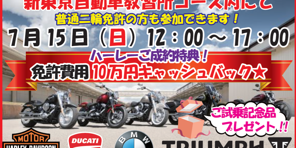6月242018イベント情報ハーレーダビッドソン東久留米のブログ開催日 :2018年7月15日(日) 開催時間:12:00~17:00 開催場所:新東京自動車教習所 参加費 :無料 持ち物 :ヘルメット・グローブ ☆普通二輪免許の方も参加できます! ☆ハーレーダビッドソンは全ての車種にご試乗いただけます! ☆その他、ドカティ・BMW・トライアンフの試乗車もございます! 特典1:ハーレーダビッドソンオリジナルグッズ(非売品)をGET! 特典2:ご成約の方には『免許費用10万円』キャッシュバック! 共有:シェア Facebook で共有するにはクリックしてください (新しいウィンドウで開きます) Facebook クリックして X で共有 (新しいウィンドウで開きます) X Post navigationPreviousPrevious post:ちぃさいけど便利なヤツ!~HD純正シングルスイングアームバック~NextNext post:FLFBS☆坂上様よりユーザーズボイスを頂きました!