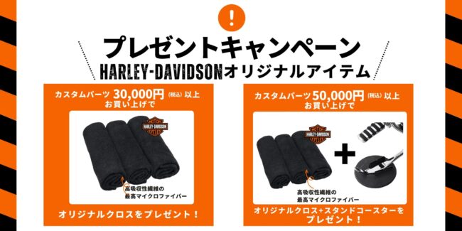 本日より、当店オンラインショップ限定プレゼントキャンペーンを開催致します! カスタムパーツを3万円以上お買い上げのお客様に当店オリジナルクロスをプレゼント致します。 また、カスタムパーツ5万円以上お買い上げ頂いたお客様に…