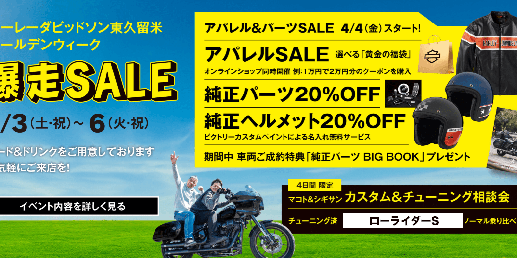 ハーレーダビッドソン東久留米では、5月3日(土・祝)~6日(火・祝)の4日間限定で「ゴールデンウィーク爆走SALE」を開催します。