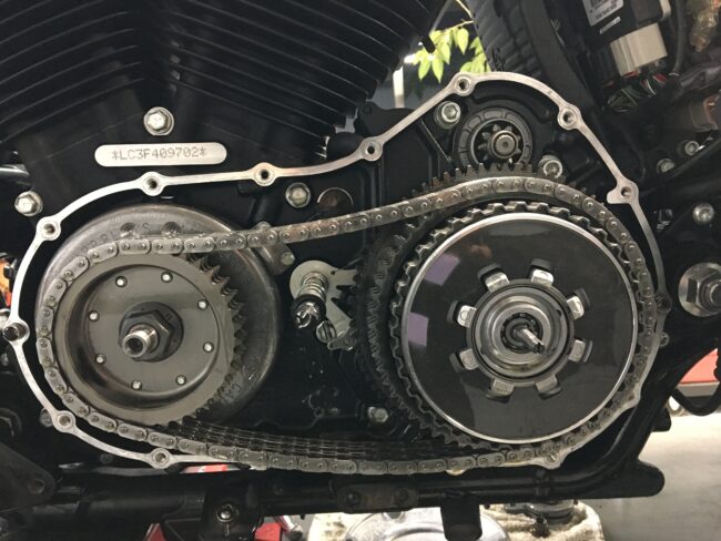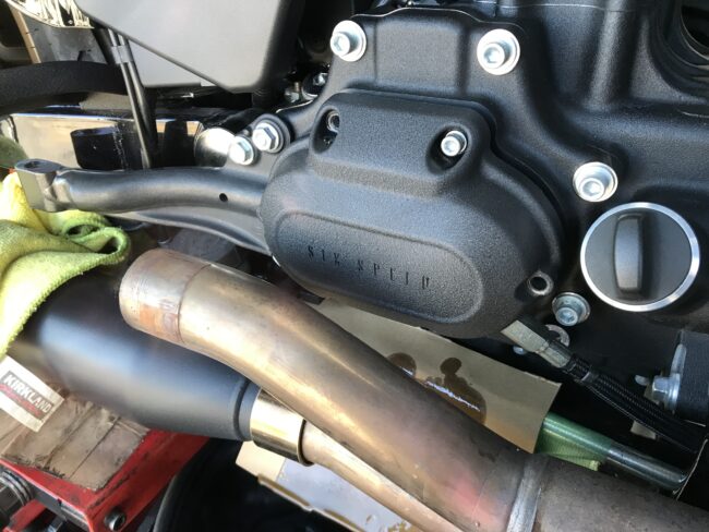 スポーツスターのスターターモーター オイルシール交換作業です。 プライマリーケースを外すと スターターモーターの固定ネジが出てきます。 この2本のネジを外し スターターモーターを引き抜きます。 モーターを抜くとこんな感じ…