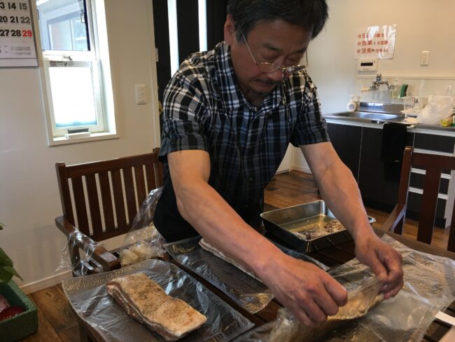 3日からのイベントで振る舞う手作りベーコン! 丹精込めて社長が製作中です。 数日寝かせた後、燻製して完成とな…