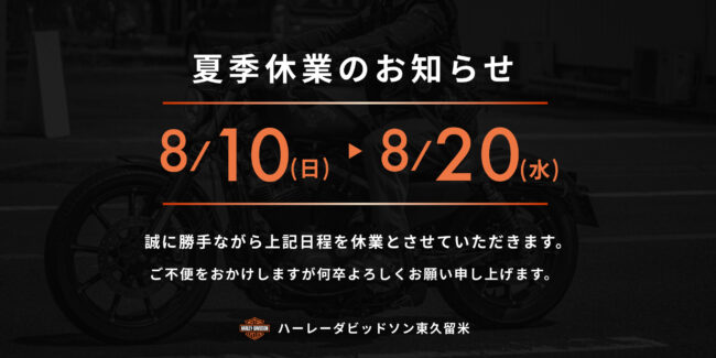 ハーレーダビッドソン東久留米に格別のお引き立てを賜り、誠にありがとうございます。 当店の夏季休業をお知らせさせて頂きます。 夏季休業:8月10日(日)から8月20日(水)まで ご不便をおかけしますが、何卒ご…