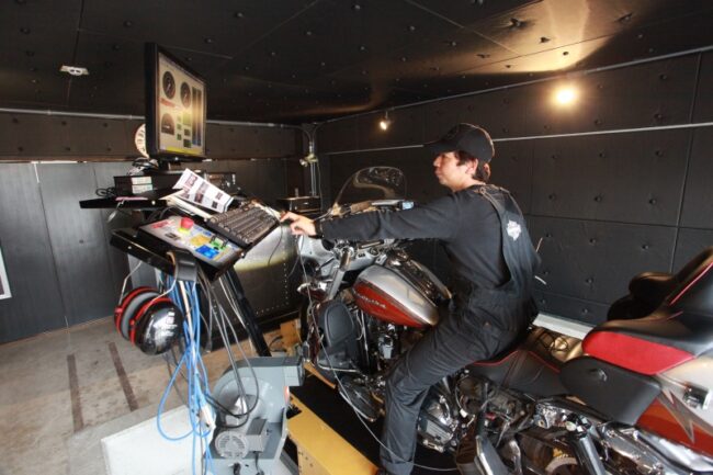 2009,FXDF ダイナファットボブのチューニングの様子です SE製のエアークリーナー&カムシャフトを装備! 測定前の準備でクーリングファンの位置合わせをしています 風の向きによってエンジンの温度がまったくちが…