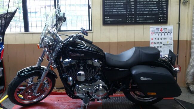 納車前のXL1200Tです(^-^)/ これからカスタムパーツ 納車前点検に入ります(^-^ゞ ツーリングをする際に必要な装備が揃っており(;o;) さらに追加でシーシーバーを装備するとタンデムも楽になります(__) ま…