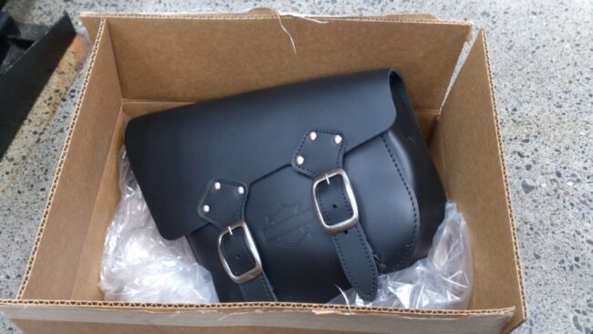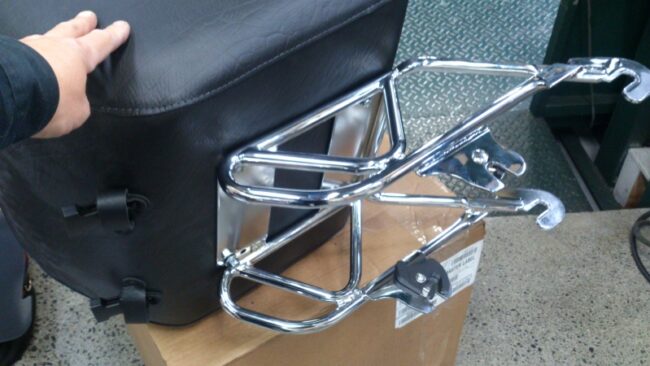 ちょっとした荷物をという方に こちら(^o^)/ 今回は、ソフテイルのスイングアームに取り付けいたします(^-^ゞ 付属されているベルト3本で固定しています(^o^) スッキリ収まり 格好いいですねd=(^o^)=b