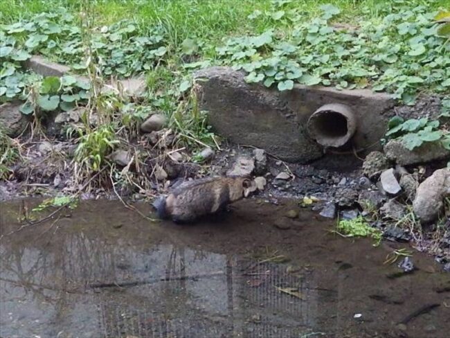 本日、裏の入り口に珍客来店! この写真でわかりますか? タヌキさんがご来店です 2年前には、二匹でいらっしゃたのですが、今日はお一人でした。
