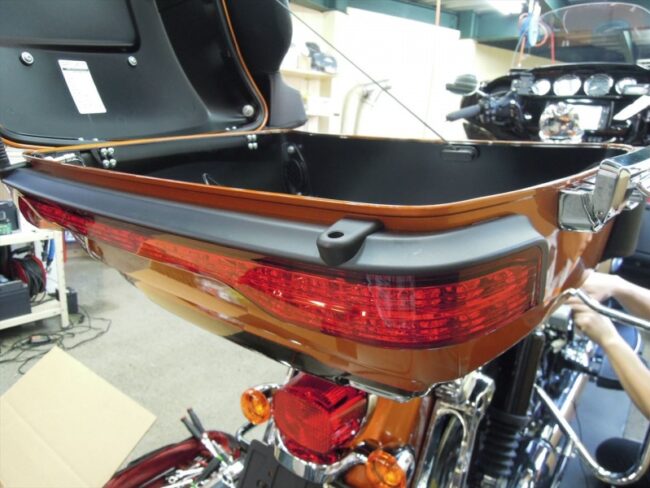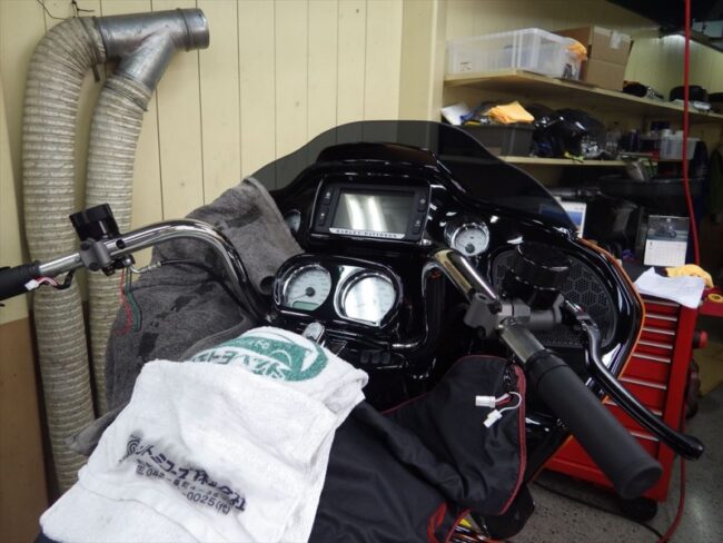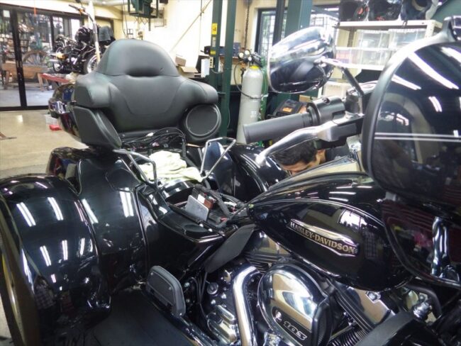今週末納車のFLHTCUTG トライク、納車整備中です! ETCやナビを取り付けています! 登録終了後にクリスタークォーツ加工がまっています。