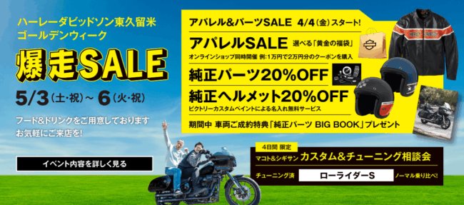 【ハーレーダビッドソン東久留米 ゴールデンウィーク爆走SALE開催】 ハーレーダビッドソン東久留米では、5月3日(土・祝)~6日(火・祝)の4日間限定で「ゴールデンウィーク爆走SALE」を開催します。 期間中は、アパレル…