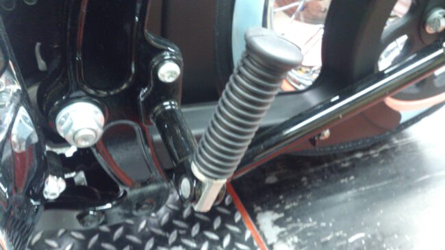 明日は 新東京自動車教習所で試乗会です。 是非、ご参加くださいませ(__) と、今回はソフテイル デラックスのノーマルパッセンジャーフットペグをカスタムパッセンジャーフットボード交換作業を致しました(^_^ゞ こんな感じ…