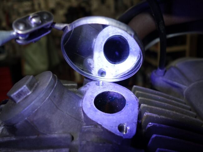 ゴリラのインレットポートのねじ山がダメになり修正することになりました。 マフラーやキャブレターを外してシリンダーヘッドを取り外します。 シリンダーヘッドが外れました! ダメになったねじ山にヘリサートコイル用のタップをたて…