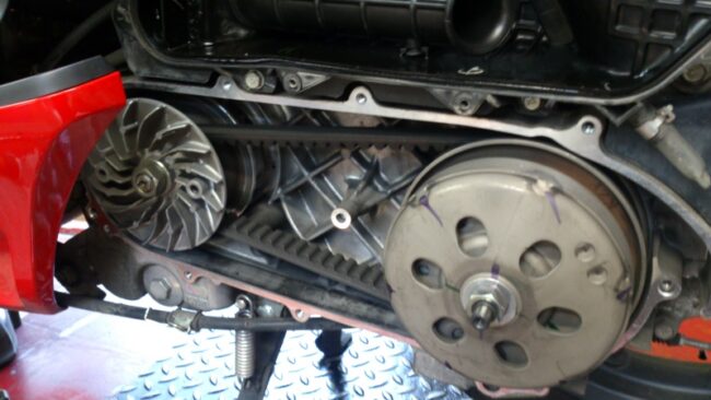 定期点検でお預かりのスクーター 距離を走られていたので 駆動系のチェックを致しました(^_^ゞ クラッチの減りを見るべく 取り外します(^^)/ クラッチはだいぶ減っており 基準値を超えていたので交換になります。 ドライ…