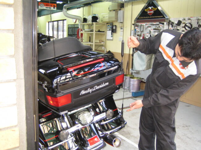 今回は2008年、105周年記念のFLHTCUのアイドリング調整の様子です。 [ 各画像をクリックすると拡大表示されます。] 保管場所のガレージから限定モデルをピットに移動します。本日は(200…