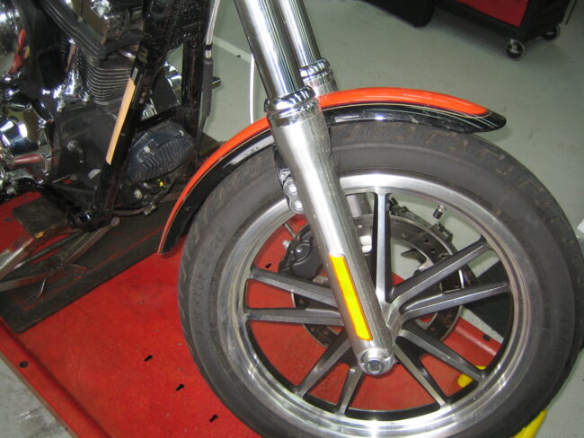 フロントフォーク(フォークスライダー)をクロームメッキのぴかぴかパーツに交換致します。 [ 各画像をクリックすると拡大表示されます。] 今回、交換する車種は2008年モデルFXDLです。 こちらの写真はノー…