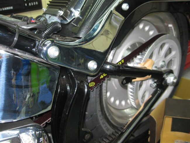 08モデルローライダーのノーマルの黒いスウィングアームをぴかぴかのクロームスウィングアームに交換する作業です。 [ 各画像をクリックすると拡大表示されます。] こちらがノーマルの黒のスウィングアームです。 …