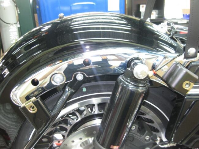 足つき性は重要ですよね!今回はFLSTFのローダウン作業の様子です。 [ 各画像をクリックすると拡大表示されます。] ソフテイルはリアサスが見えないデザイン(リジットサス風)になっております。 下からのぞ…