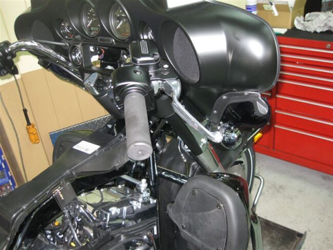 最近、よく雑誌で目にするプロトのハーレー用ハンドルに交換します。 [ 各画像をクリックすると拡大表示されます。] こちらが交換前の状態です。 FLHTCUのカウルを取り外します。カウルが付いて…
