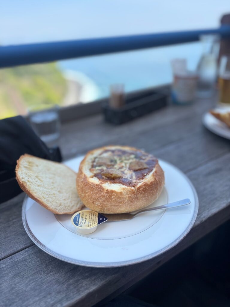 パンの香ばしさと濃厚なシチューの相性が抜群で、海を眺めながらの