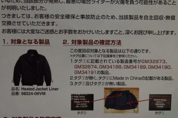 ハーレー純正ヒーテッドジャケットライナー(98324-09VM)をお持ちのお客様へお詫びとお知らせ 2010年7月~2012年2月出荷の上記製品において、腰部分で配線が重なっているため、当該部分が発熱し、最悪の場合ライダ…