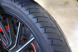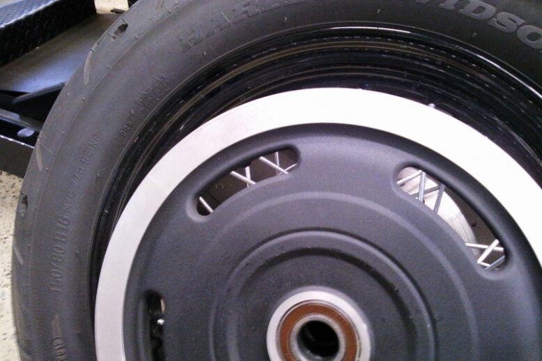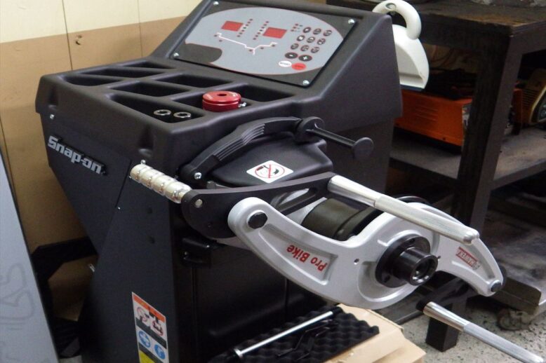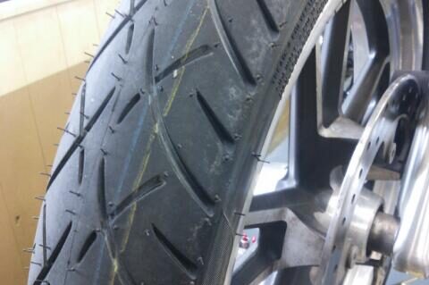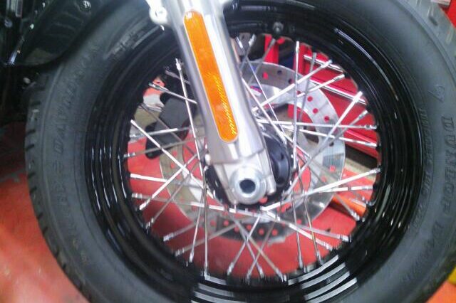 FXSBのカスタムです 今回前後のホイール交換! リヤータイヤが外れました TURBINE WHEEL(40900324)の取り付けです タイヤを組み替え手前に見える黒いホイールバランサーを使って正確に バ…