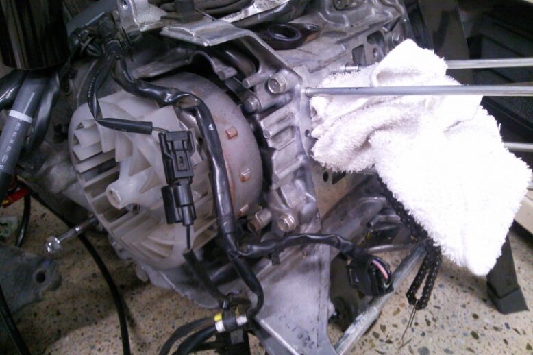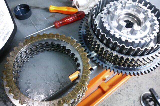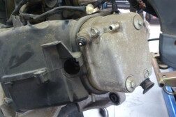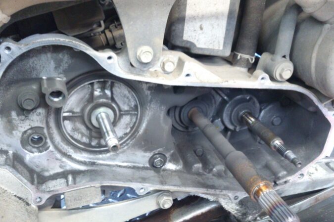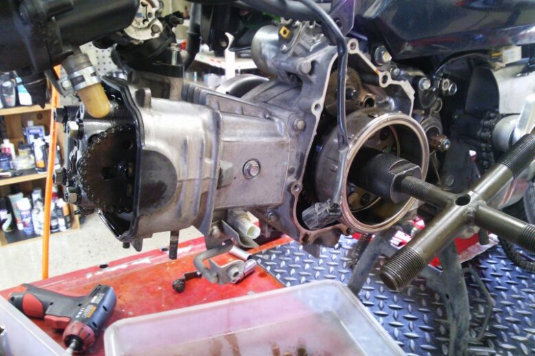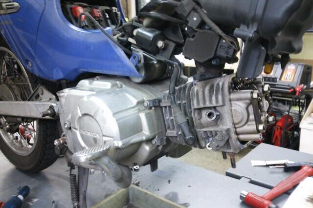 カブのトランスミッション修理です(≡^∇^≡) エンジンをバラして・・・ クランクケースを割ります・・( ̄Д ̄;; ここでやっとトランスミッションとご対面(/_<) 原因を調べますよ~m(_ _)m