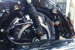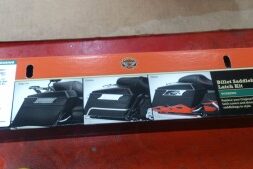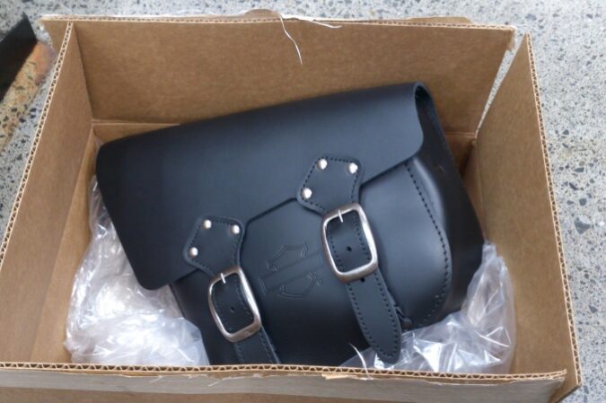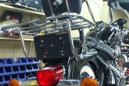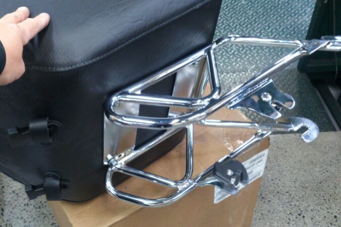 ちょっとした荷物をという方に こちら(^o^)/ 今回は、ソフテイルのスイングアームに取り付けいたします(^-^ゞ 付属されているベルト3本で固定しています(^o^) スッキリ収まり 格好いいですねd=(^o^)=b