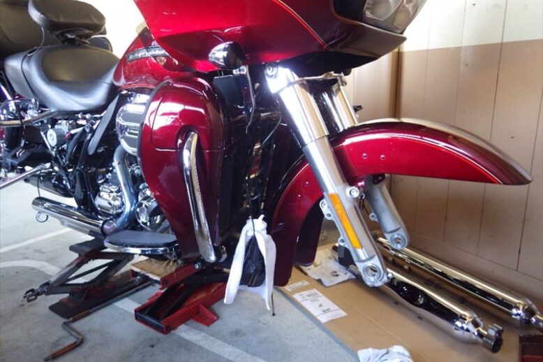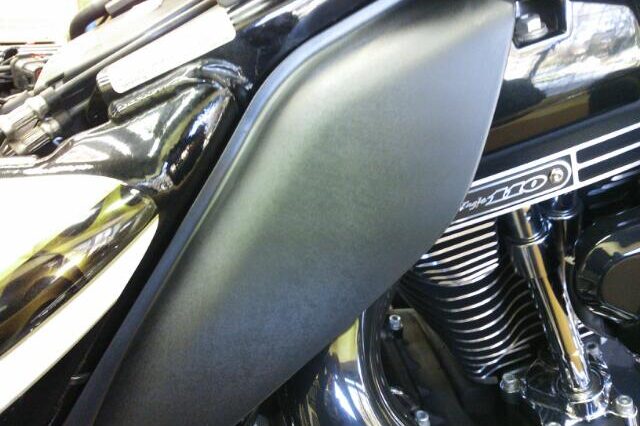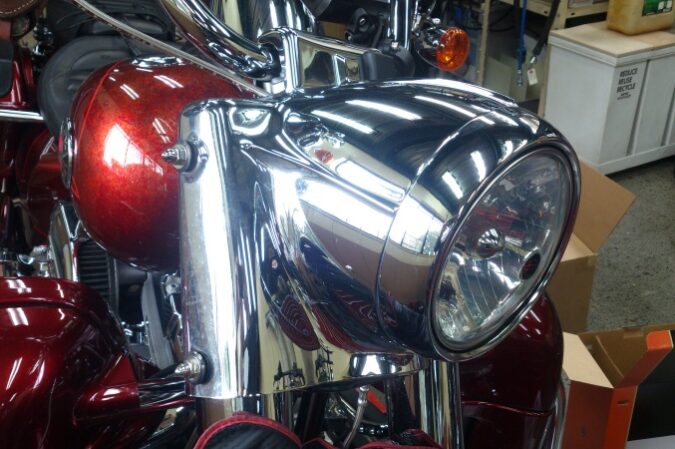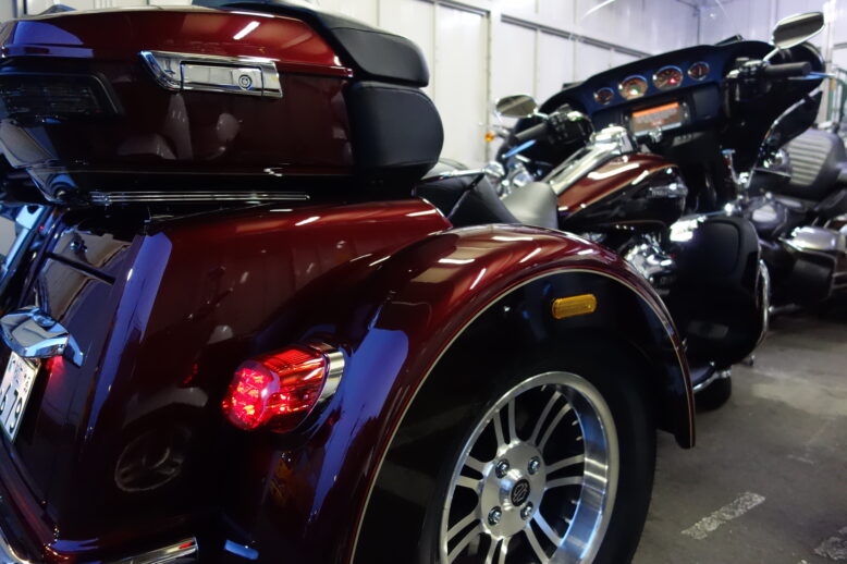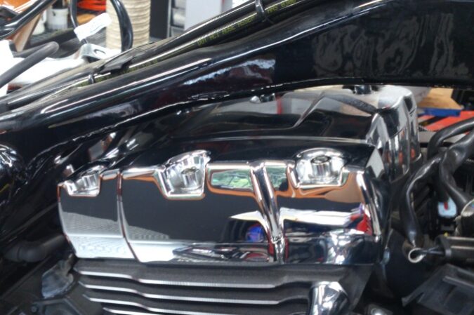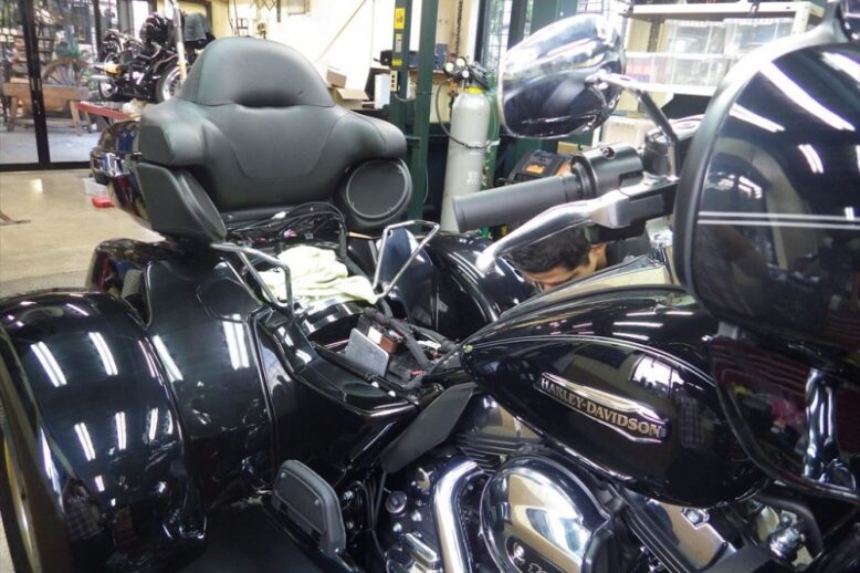 明後日に納車予定のTRI GLIDE ULTRA (TRIKE)に究極の ボディーコーティングCRYSTER QUATZ-クリスタークォーツ-を 施工しました!! 施工前の下地作りの様子です。 ボディ以外にエンジンや足回…