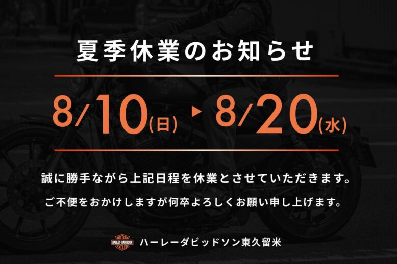 ハーレーダビッドソン東久留米に格別のお引き立てを賜り、誠にありがとうございます。 当店の夏季休業をお知らせさせて頂きます。 夏季休業:8月10日(日)から8月20日(水)まで ご不便をおかけしますが、何卒ご…