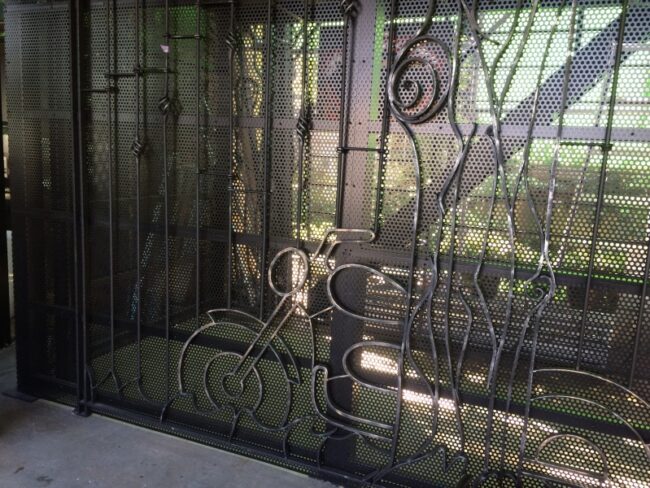いよいよ本日から通常営業です!長らく夏季休暇のためご迷惑お掛けいたしました。 こちらの写真は新サービス工場へとつながるエレベーターです。 ただの柵だった囲いが、癒しの空間に変身しました。 さすが鉄人の鉄人・鍛鉄工芸家西田…