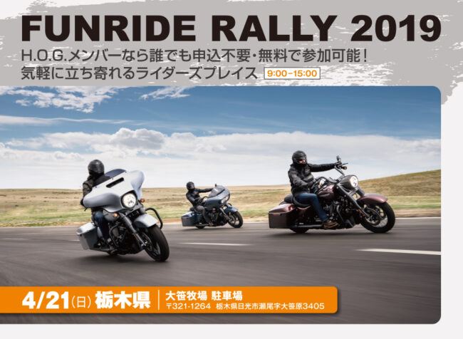 日時:2019年4月21日(日)(ALFA前7時出発) 場所:大笹牧場 駐車場 「H.O.G.ファンライドラリー in 栃木」 (栃木県日光市瀬尾字大笹原3405) 今回のツーリングは 栃木県の大笹牧場にて H.O.G.…