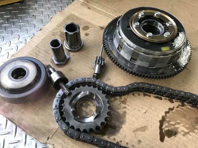 シフターシャフトのオイル漏れ修理です。 ここからプライマリーケースに流れ オイルが垂れてました。 シャフトの奥に見えるのがオイルシールです。 ここのシールの交換作業には・・・・・…(´д≡; )a゙ いろいろと外す作業が…