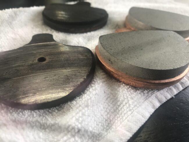 フロント周りからの異音・・ ということでご入庫頂きました(*^_^*) 早速、押してみるとギーギーキ~と(゜Д゜) ブレーキパッドが見事になくなってました 鉄板ブレーキです( ̄0 ̄) 新品と比べると一目瞭然ですね(*^_…