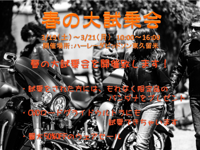 【春の大試乗会 開催のご案内】 春の大試乗会を開催致します。 普段乗ったことのない車両にまたがり、試乗してみませんか? 一般道を自由に走ることができるので、HARLEYを思う存分楽しむことが出来ますよ。 また今回の試乗車…