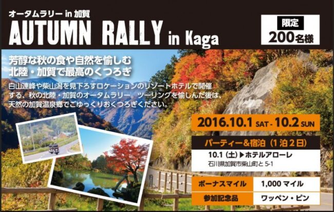 【オータムラリーin加賀】 10月のHOG主催☆宿泊ツーリング『秋の北陸・加賀のオータムラリー』 日程:2016年10月1日(土)~2日…