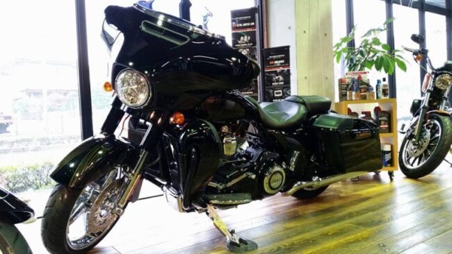 現在、ショールームにて2015年FLHXSE CVO ストリートグライド スターファイアブラック/ゴールドダストフレイム を展示しております!とてもシックな色合いなのにオシャレな塗装。一度ご覧になってくださ…